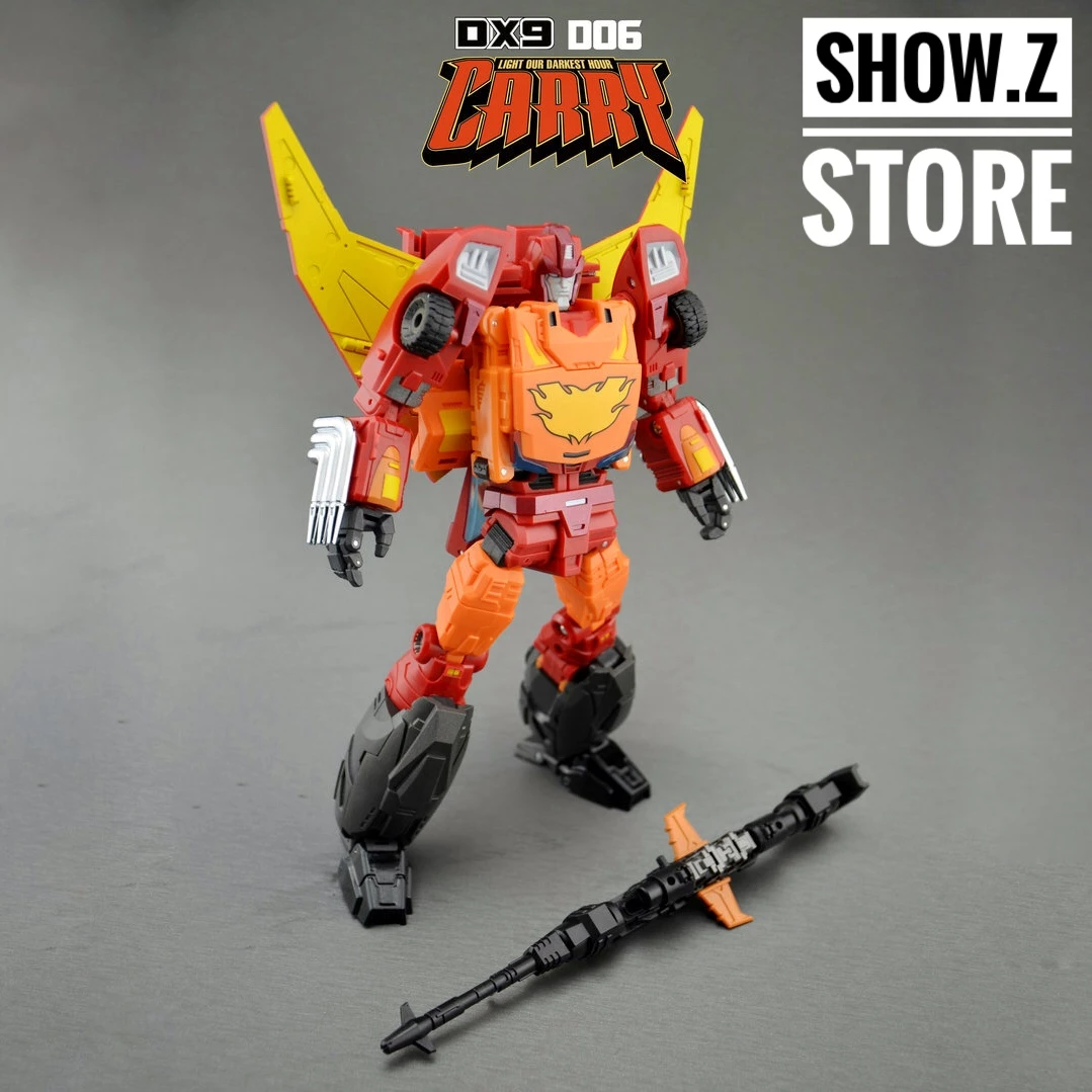 D06 Carry is a robot that also transforms into a futuristic truck and trailer. He is able to transform without detaching any parts and features metal feet and rubber tires.